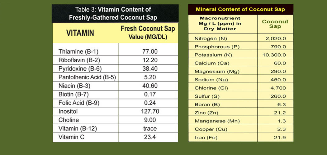 La maravillosa y más notable manera de aprovechar un árbol de coco, es que una vez que se aprovecha, fluye su savia continuamente durante los próximos 20 años. Desde el punto de vista de la sostenibilidad, la producción de energía aprovechable de los árboles de coco para su savia (que produce 5.000 litros por hectárea), en lugar de permitirles producir frutos, es de 5 a 7 veces mayor por hectárea que la producción de aceite de coco de cocos maduros.