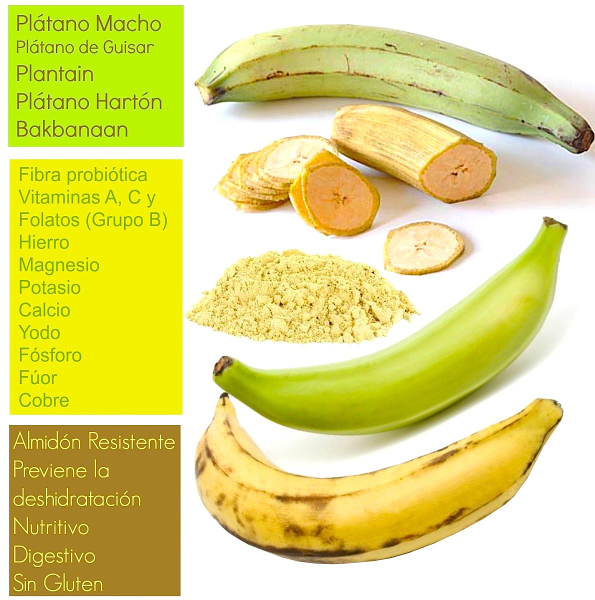 La harina de plátano o banana (plantain) es un producto alimenticio que se obtiene a partir de la banana verde y es un alimento libre de gluten, y almidón es resistente.